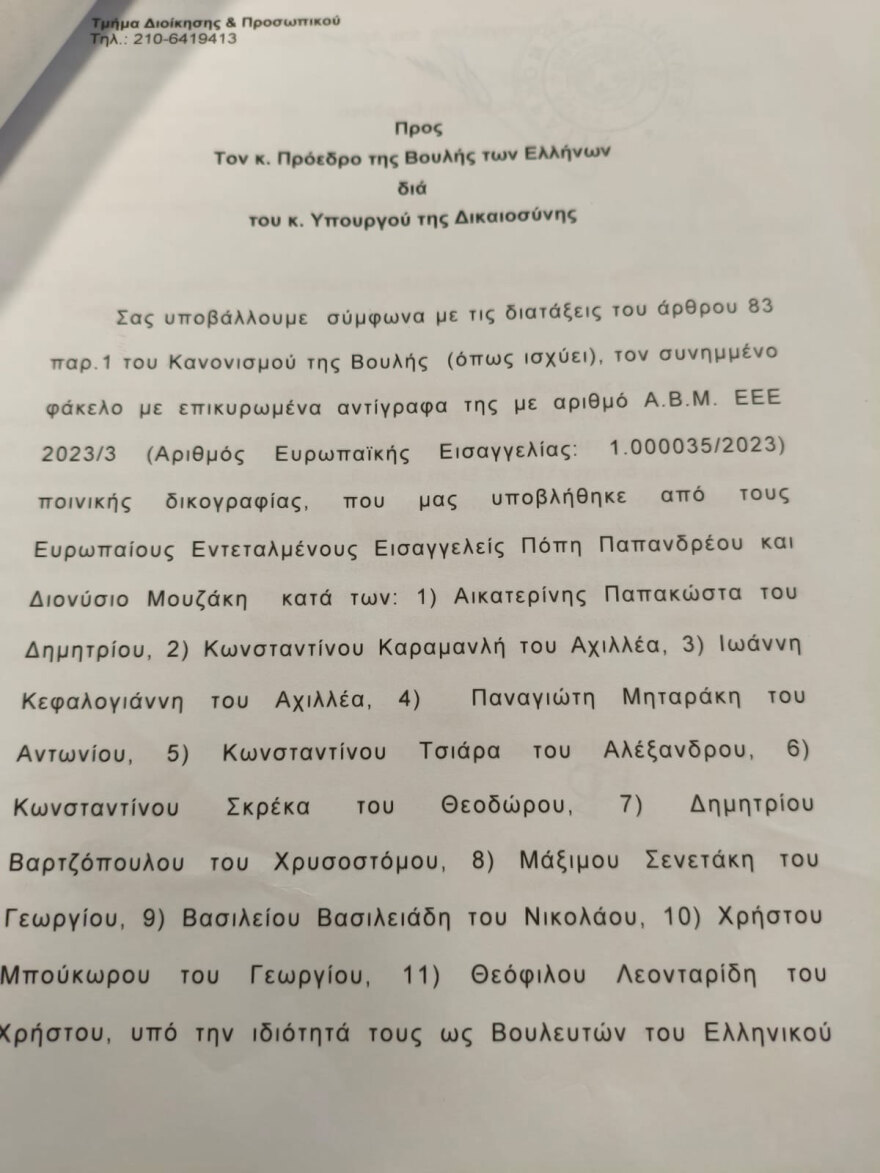 Η Βουλή καλείται να αποφασίσει για την άρση ασυλίας και τη σύσταση προανακριτικής επιτροπής.Τα δύο διαβιβαστικά της ευρωπαικής εισαγγελίας που συνοδεύουν τις δικογραφίες για την υπόθεση του ΟΠΕΚΕΠΕ και ζητούν την άρση ασυλίας 11 εν ενεργεία βουλευτών και την παραπομπή σε πριοανακριτική επιτροπή του πρώην Υπουργού Αγροτικής Ανάπτυξης Σπήλιου Λιβανού και της υφυπουργού του το 2021 Φωτεινής Αραμπατζή φέρνει στην δημοσιότητα το protothema.gr.