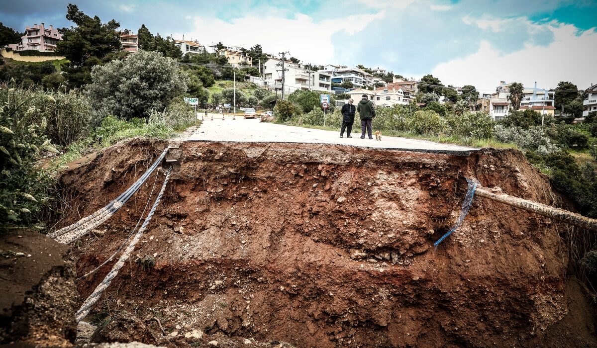 Στην Καλλιτεχνούπολη, ο δρόμος που τη συνδέει με τη λεωφόρο Μαραθώνος κόπηκε στη μέση, ανοίγοντας μια πραγματική χαράδρα, από το φουσκωμένο ρέμα της Αγίας Παρασκευής.